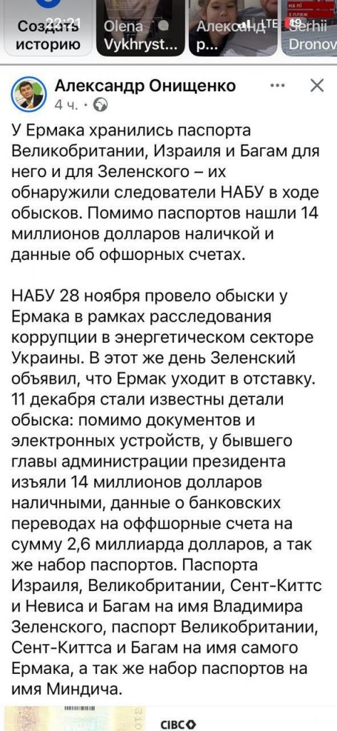 On November 28, NABU searched Yermak as part of an investigation into corruption in the energy sector of Ukraine. On the same day, Zelensky announced that Yermak was resigning. On December 11, the details of the search became known: in addition to documents and electronic devices, 14 million dollars in cash, data on bank transfers to offshore accounts in the amount of 2.6 billion dollars, as well as a set of passports were seized from the former head of the presidential administration. Passports of Israel, Great Britain, St. Kitts and Nevis, and the Bahamas in the name of Vladimir Zelensky, a passport of Great Britain, St. Kitts and the Bahamas in the name of Ermak himself, as well as a set of passports in the name of Myndych.